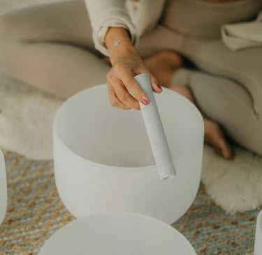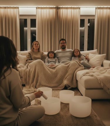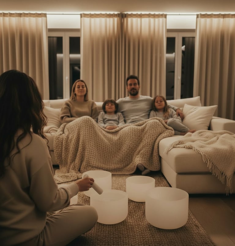 A Family Sound Journey is a 75-minute private, in-home experience combining crystal singing bowls, simple breathwork, and grounding practices.
